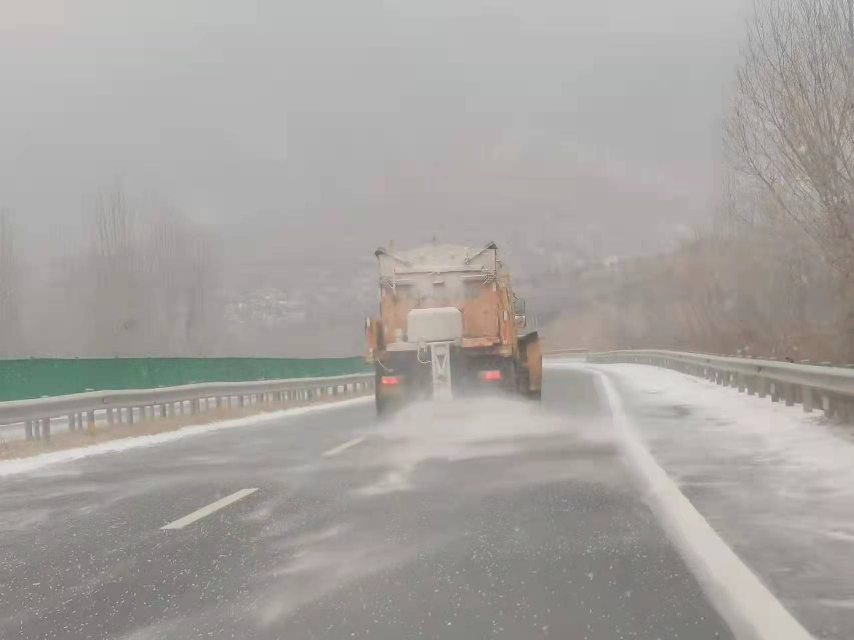 一方面安排巡查人員上路查看路面雪情,另一方面調(diào)動(dòng)養(yǎng)護(hù)人員、機(jī)械迅速到位,及時(shí)對(duì)積雪較厚的路段實(shí)施除雪車(chē)機(jī)械除雪,并用滾刷及時(shí)清掃,同時(shí)播撒融雪劑。目前京新、京藏、海張高速降雪路段路面見(jiàn)黑符合通行條件,降雪還在持續(xù),中心養(yǎng)護(hù)隊(duì)伍始終堅(jiān)守在一線,保證高速公路的暢通。